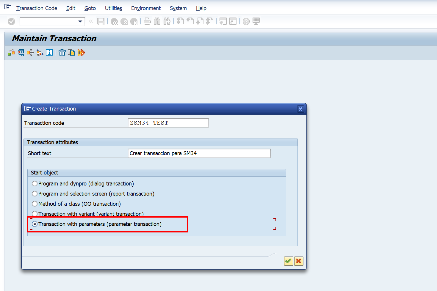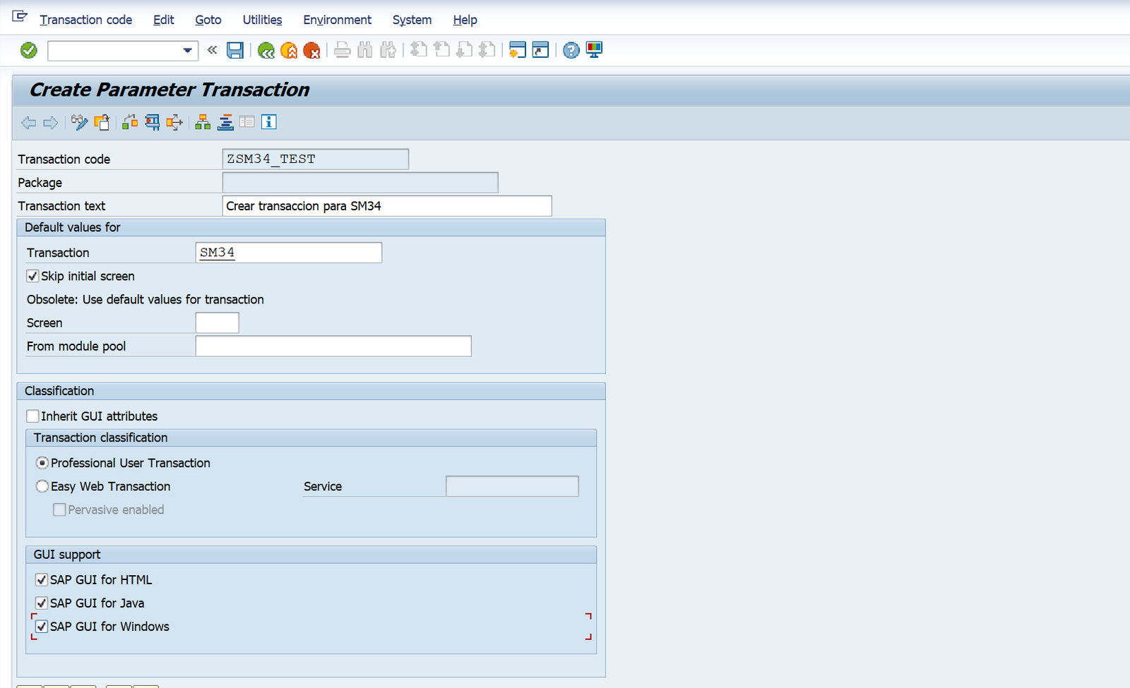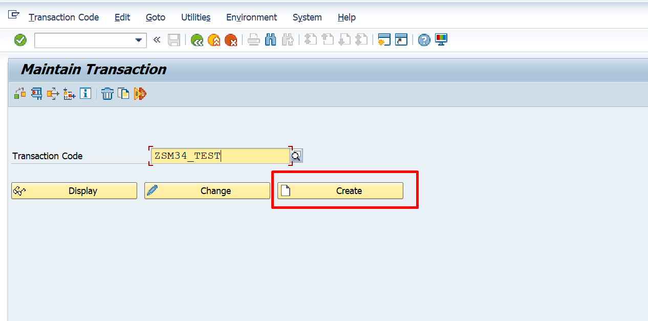 2. En el campo “Código de transacción”, escribe el nombre que tendrá tu t-code, por ejemplo: ZSM34_TEST.